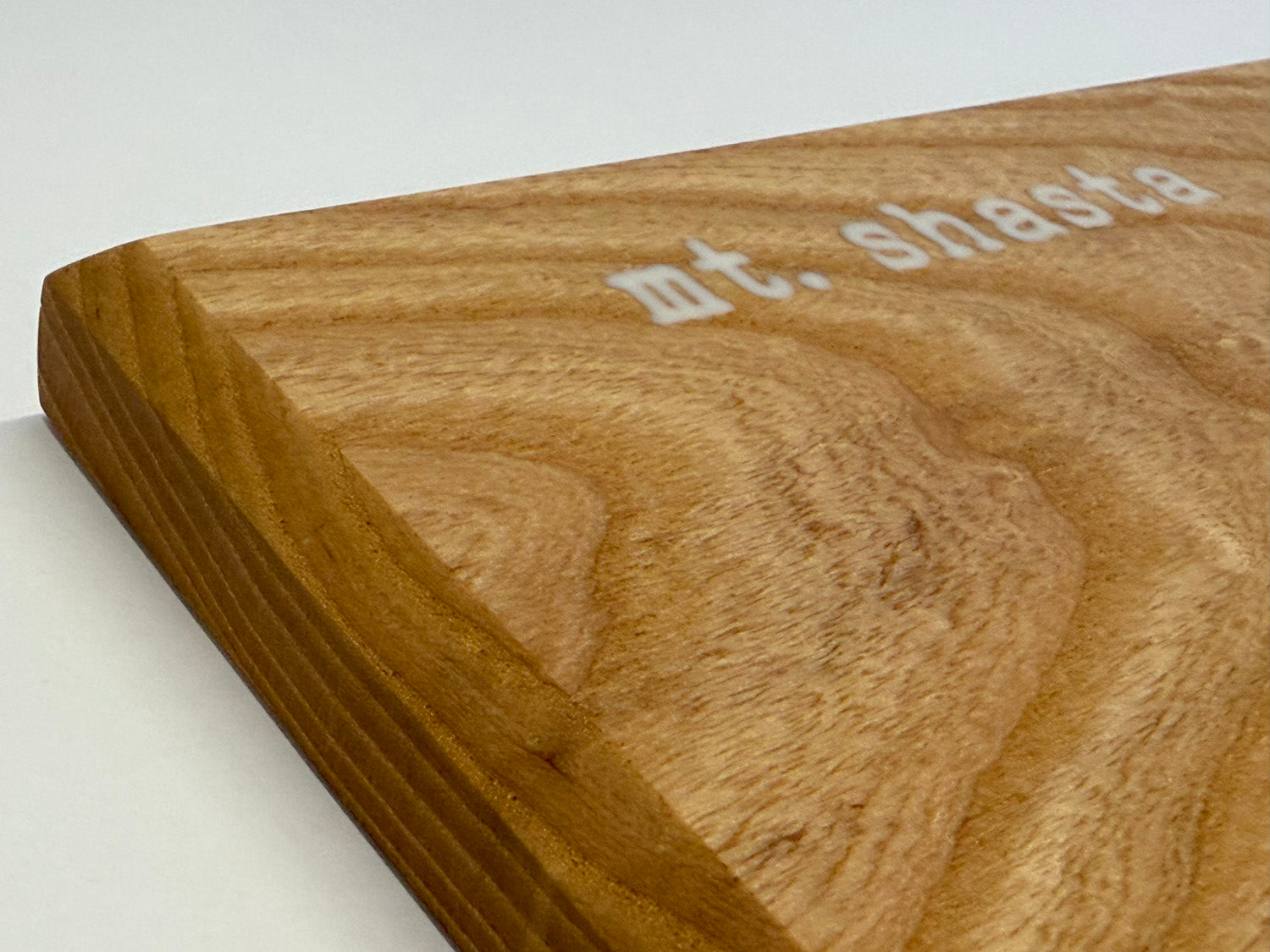 This minimalist piece showcases the gentle slopes of Mt. Shasta through a flowing white resin inlay, framed by contrasting hardwoods. An elegant tribute to one of California’s most iconic peaks—perfect for mountain lovers and design enthusiasts alike.